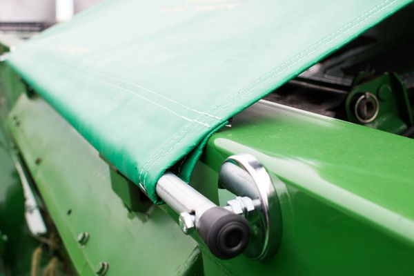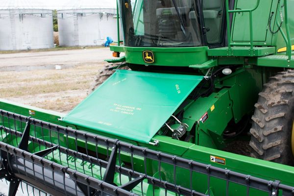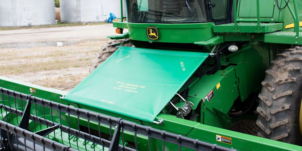 The debris deflector is made from a super thick 22 ounce poly material made here in the USA. It is mounted on the feeder house with two large magnets on the header and it also mounts up underneath the cab on most combines.